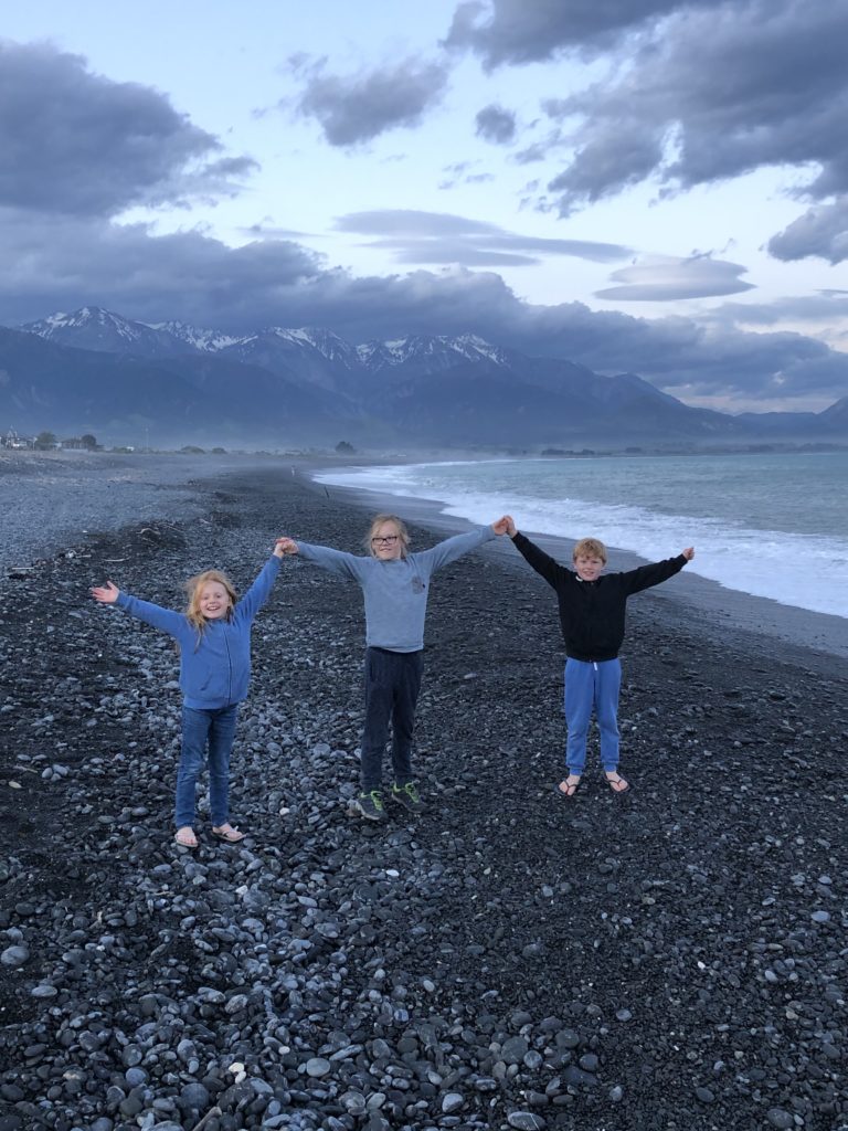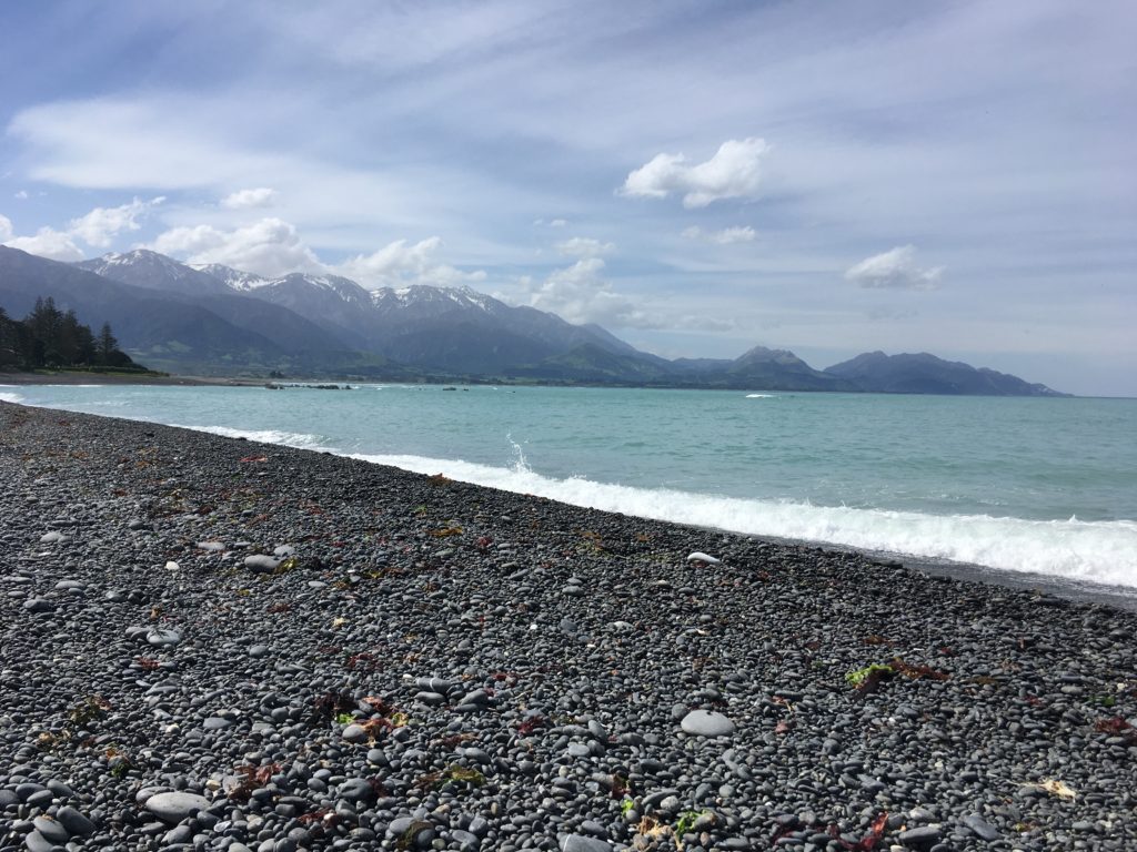 Die Route auf der Südinsel machen wir stark vom Wetter abhängig. Das bedeutet, dass wir immer wieder umplanen und Alternativen überlegen. So stellen wir (vorläufig, wie zunächst gedacht) den Abel Tasman Nationalpark hinten an, da es dort wie an der gesamten Westküste wie aus Kübeln schüttet. Stattdessen ist unser nächster Stopp Kaikoura an der Ostküste – Katinkas Lieblingsort von vor 21 Jahren. Die Strecke nördlich und südlich der Stadt, die für Wal- und Delphinbeobachtungen berühmt ist, verläuft direkt an der spektakulären Küste und wird zu unserer nächsten „Traumstraße der Welt“ (Nummer 4 nach Kanada, Hawaii und Australien).