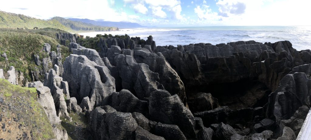 Highlight hier sind die Pancake Rocks, Felsen, die wie übereinandergeschichtete Pfannkuchen aussehen und Dank der immer noch wilden See, sind die Blowholes ebenfalls sehr beeindruckend.