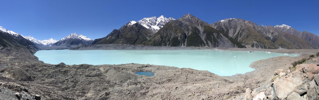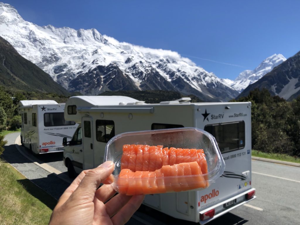 Doch der Ausblick reicht uns nicht: auf einem Tagestrip geht es in den Mount Cook National Park und wir erleben einen unvergesslichen Tag in den Neuseeländischen Alpen. Ein Zwischenstopp dorthin ist die höchstgelegene Lachsstation der Welt, wo wir mit Sashimi, Räucherlachs und Lachsfilet für die abendliche Lachs-Sahne-Pasta auch das komplette Angebot erstehen. Außer uns sind hier Massen an Japanern, die sich das Angebot natürlich auch nicht entgehen lassen können.