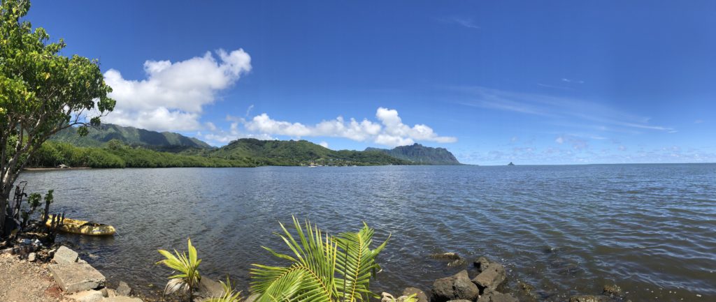 Wir entscheiden uns, in den nächsten zwei Tagen einen Mietwagen zu buchen und den Rest der Insel zu erkunden und siehe da, wie auf Malle ist auch hier das Hinterland schön und sehenswert. Es gibt tolle Badestrände, einen Highway, der km-lang direkt am Meer verläuft und nette Foodstops anbietet: z.B. Musabi (gebratenes Dosen-Corned Beef „Spam“ auf einem Block aus Sushi-Reis – sehr lecker) und Krabben mit sehr, sehr viel Knoblauch. Die legendäre North Shore mit den höchsten Wellen auf Hawai’i erweist sich an diesem Tag leider als sehr zahm, dafür gibt´s lecker buntes Shave Ice für alle.