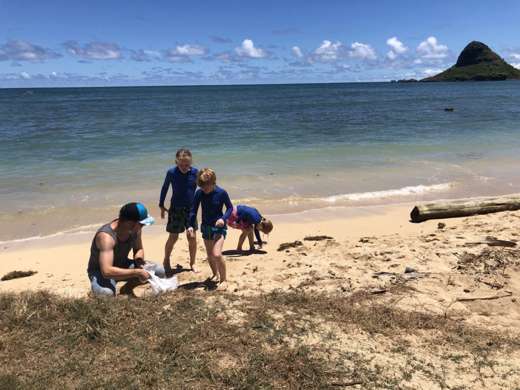 Da unser Beachcleaning auf Kauai – erfreulicherweise – nicht funktioniert hat, starten wir auf O’ahu nochmals einen Versuch. Während eines Badestopps an einem wirklich schönen Strand an der Nord-Ostseite der Insel fallen uns die vielen farbigen Brocken in dem eigentlich aus zerbröselten Korallen bestehenden weißen Sandstrand auf – Mikroplastik noch und nöcher. Neben den farbigen Stücken finden wir bei näherem Hinsehen auch sehr viele weiße bzw. durchsichtige Stückchen, die kaum vom Sand zu unterscheiden sind – ein sehr trauriger Anblick. Uns wird hier plasti(k)sch vor Augen geführt, dass die Aktion nur ein symbolischer Tropfen auf den heißen Steinen sein kann. Das war uns ja zwar schon vorher klar, allerdings zeigt einem die mühsame Arbeit, wie schwierig es ist, unseren ganzen Müll wieder einzufangen.