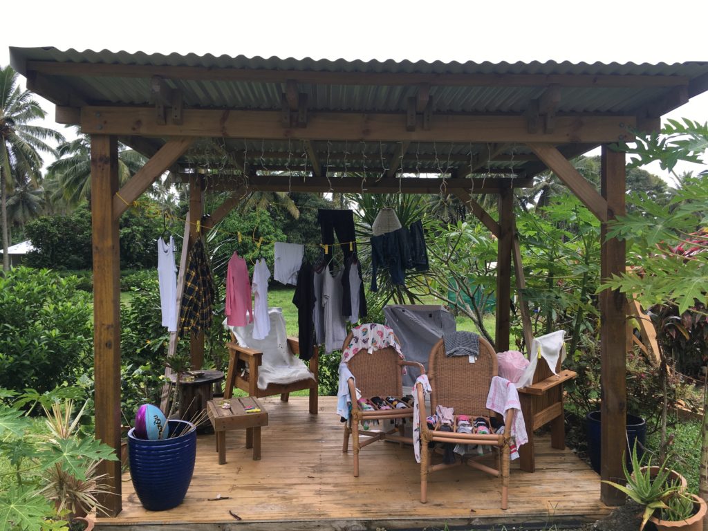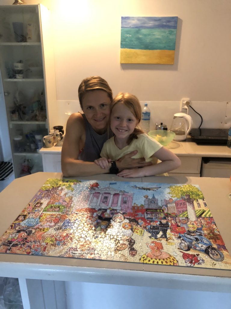 Regen hat aber auch Vorteile: joggen ist erträglich, wir puzzeln seit Jahren das erste Mal wieder, wertschätzen unseren heimischen Wäschetrockner, schaffen einigermaßen Schule und lassen uns zum Kauf von lokalen Klamotten hinreißen …