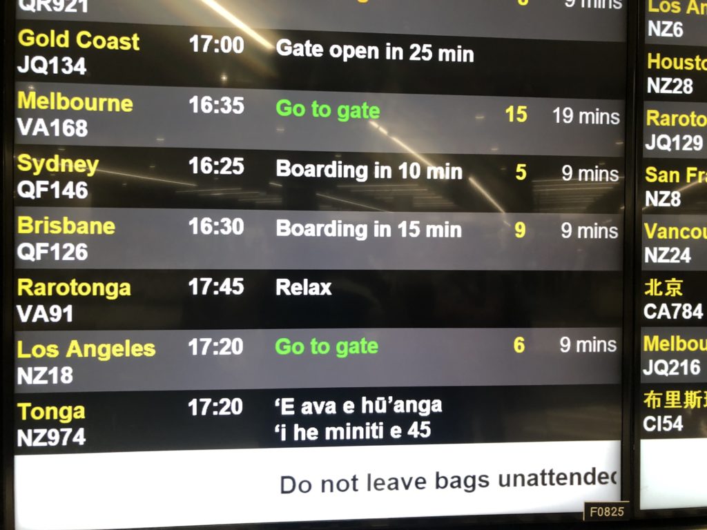 In unserem Flieger sitzen mehrere Schulklassen, die scheinbar eine Klassenfahrt auf die Cook Inseln machen – es muss also nicht immer das Harzheim sein. Relax scheint auch beim Boarding angesagt zu sein: Nach dem Aufruf zum Boarding tut sich überhaupt nichts und Frank fragt vorsichtig nach, ob wir denn schon einsteigen können. Daraufhin die Stewardess: „Na klar, aber auf meinen Aufruf reagiert ja keiner…“ So steigen wir zum ersten Mal als erste in den Flieger, in dem es kurz danach Dank der beiden Schulklassen einen Mega-Geräuschpegel gibt.