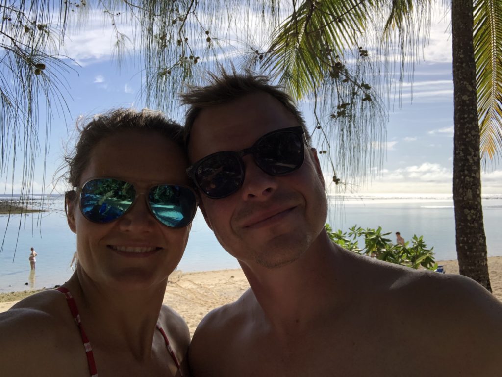 Mit einer Stunde Verspätung landen wir auf Rarotonga und merken, dass auch in abgelegenen Südseestaaten die Einreise etwas dauern kann. Unsere Gastgeberin Odette hat trotzdem auf uns gewartet und so stehen wir kurz danach vor Ihrem Mini-Toyota und fragen uns, wie 3 Erwachsene, 3 Kinder und unser respektables Gepäck da hineinpassen sollen – aber es klappt! Odette kommt gebürtig aus Gera, hat länger in Berlin gelebt und ist über Australien schließlich auf den Cook Inseln gelandet, wo sie mit Joe ein paar Ferienhäuser auf ihrem Grundstück vermietet. Das Ganze hat Bauernhof-Atmosphäre, gibt es doch unzählige Hühner (und Hähne, die uns morgens recht zeitig aufwecken, danach halfen Ohropax), zwei Ziegen, Katzen und sogar ein Schwein. Die Kinder finden´s super und wir genießen die Gastfreundschaft und das tolle Frühstück jeden Morgen mit frisch gepflückten Bananen und Papaya in Hülle und Fülle.