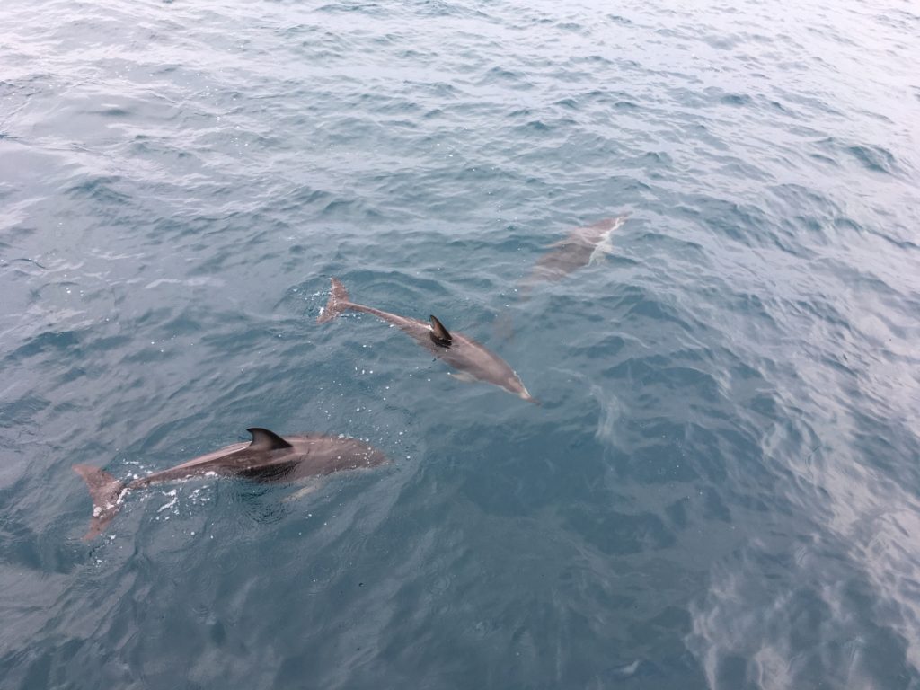 Unser Highlight ist das Schnorcheln mit Delphinen, die zu Hunderten unseren Weg kreuzen. Im ziemlich frischen Wasser haben wir die Chance, diese besonderen Tiere in ihrem Element zu begegnen. Besonders die Mütter mit ihren Kälbern hinterlassen einen bleibenden Eindruck und ein Dauerginsen in unserem Gesicht.