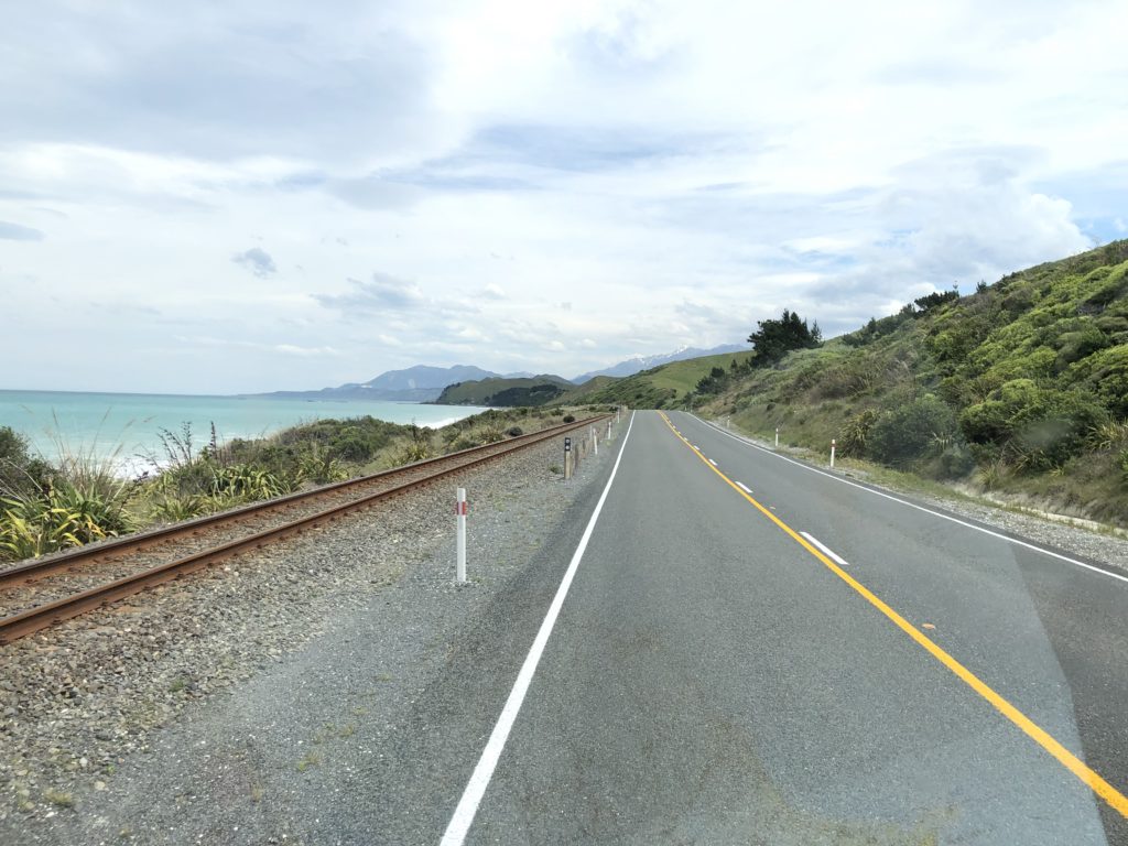 Die Route auf der Südinsel machen wir stark vom Wetter abhängig. Das bedeutet, dass wir immer wieder umplanen und Alternativen überlegen. So stellen wir (vorläufig, wie zunächst gedacht) den Abel Tasman Nationalpark hinten an, da es dort wie an der gesamten Westküste wie aus Kübeln schüttet. Stattdessen ist unser nächster Stopp Kaikoura an der Ostküste – Katinkas Lieblingsort von vor 21 Jahren. Die Strecke nördlich und südlich der Stadt, die für Wal- und Delphinbeobachtungen berühmt ist, verläuft direkt an der spektakulären Küste und wird zu unserer nächsten „Traumstraße der Welt“ (Nummer 4 nach Kanada, Hawaii und Australien).
