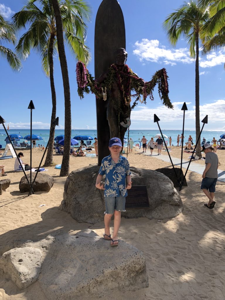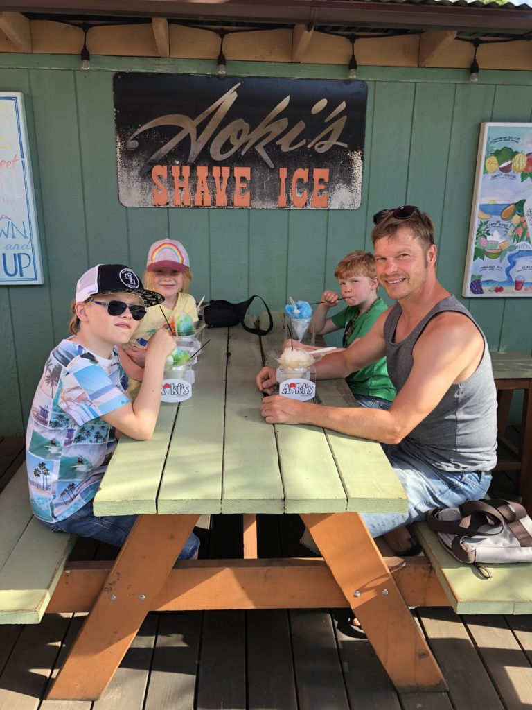 Wir entscheiden uns, in den nächsten zwei Tagen einen Mietwagen zu buchen und den Rest der Insel zu erkunden und siehe da, wie auf Malle ist auch hier das Hinterland schön und sehenswert. Es gibt tolle Badestrände, einen Highway, der km-lang direkt am Meer verläuft und nette Foodstops anbietet: z.B. Musabi (gebratenes Dosen-Corned Beef „Spam“ auf einem Block aus Sushi-Reis – sehr lecker) und Krabben mit sehr, sehr viel Knoblauch. Die legendäre North Shore mit den höchsten Wellen auf Hawai’i erweist sich an diesem Tag leider als sehr zahm, dafür gibt´s lecker buntes Shave Ice für alle.